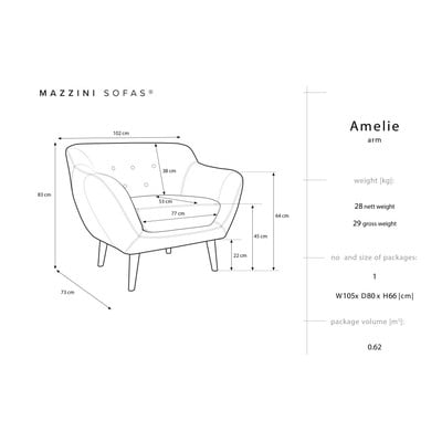 Amelie je rad sedacieho nábytku, ktorý svojím dizajnom, z ktorého je zjavné, ako pohodlné tieto modely sú, pozýva do svojej náruče. V tejto kolekcii sa snúbi inšpirácia severským štýlom s jemnými retro prvkami. Čerešničkou na torte sú potom gombíky, ktoré kreslá aj pohovky dovádzajú do dokonalosti.