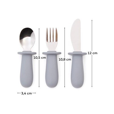 Súprava obsahuje lyžičku, vidličku a nôž. Všetky tri kusy majú robustné, ergonomické rukoväte zo silikónu, ktoré sú ideálne pre malé detské ruky. Kovové funkčné časti sú odolné a čepeľ noža je tupá a bezpečná pre deti.