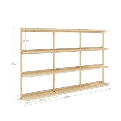 Knižnica je vyrobená z borovicového dreva v prírodnej farbe. Čisté línie a ľahké proporcie jej dodávajú takmer vznášajúci sa vzhľad, zatiaľ čo rafinované spoje pridávajú jemný, ale sofistikovaný dotyk. Rozmery knižnice sú 192 x 127 cm.