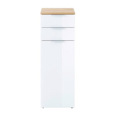 Kúpeľňová skrinka PescaraVysoká/úzka, v dekore duba, z drevotriesky, povrchová úprava: melamín, lesklá, biela/v prírodnej farbe, šírka 39 cm, výška 112 cm, hĺbka 34 cm