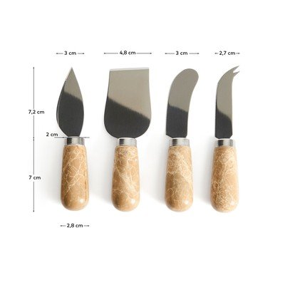 Súprava nožov na syr Adoma od značky Kave Home je súčasťou elegantnej kolekcie, ktorá vyniká svojím sofistikovaným a nadčasovým charakterom. Každý z týchto štyroch kusov je vyrobený z odolného mramoru a doplnený detailmi z nehrdzavejúcej ocele, čo celku dodáva moderný a štýlový vzhľad.