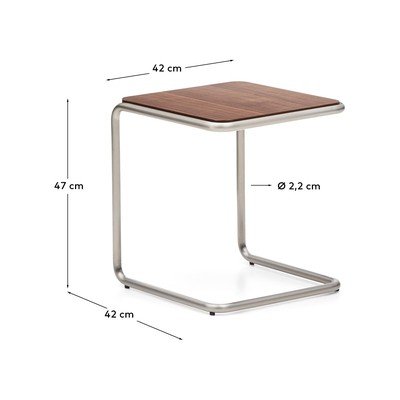 Jeho doska je vyrobená z 0,6 mm hrubej orechovej dyhy, ktorá kontrastuje s podnožou z brúsenej rúrkovej nehrdzavejúcej ocele. Vďaka tomu stolík pôsobí moderne a rafinovane.