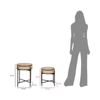 Väčší stolík má priemer 40 cm a výšku 50 cm. Jeho košík má priemer 36,5 cm a výšku 9 cm. Menší stolík má priemer 35 cm a výšku 40 cm, s košíkom s priemerom 31,5 cm a výškou 9 cm.