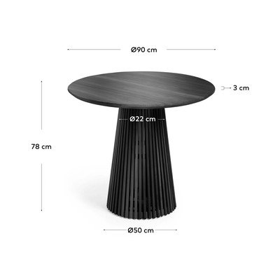 Okrúhly jedálenský stôl Jeanette od značky Kave Home. Povrch z masívneho dreva s tmavou úpravou a viditeľnou kresbou dodáva interiéru autentický charakter.