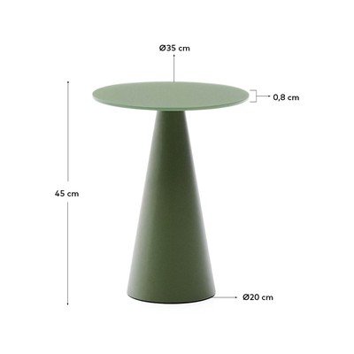 Okrúhly odkladací stolík Wilshire od značky Kave Home. Kónická oceľová základňa mu dodáva stabilitu a neobvyklý vzhľad.