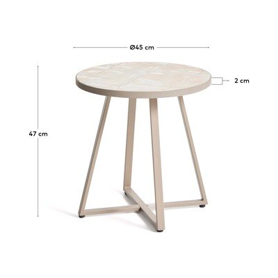 Okrúhly záhradný stolík Tella od značky Kave Home je ideálnym doplnkom pre vaše vonkajšie posedenie. Každý kus sa pýši ručne vyrobenou doskou z dlaždíc, ktorá mu dodáva jedinečnú textúru a vzhľad.