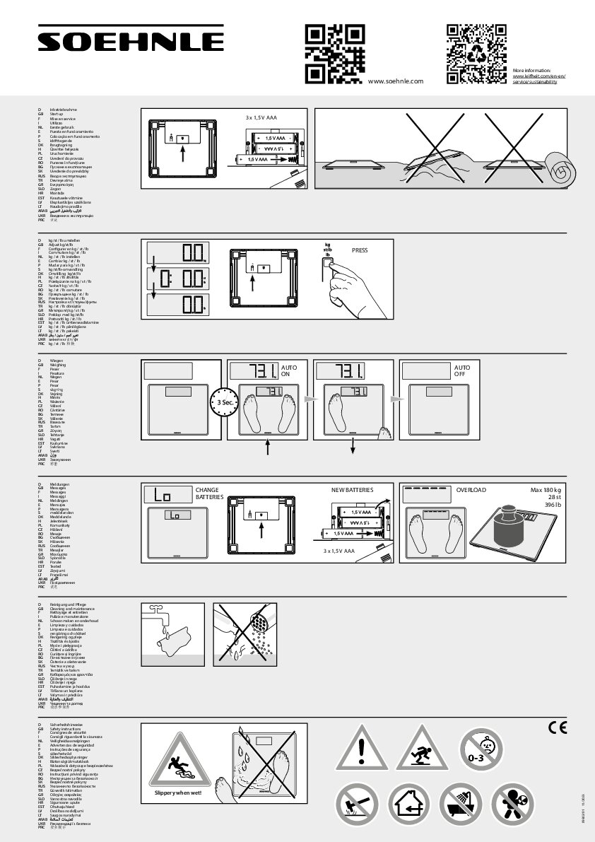 Osobná váha Sense Safe 300 značky Soehnle je ultratenká digitálna váha s extra veľkou nášľapnou plochou z nehrdzavejúcej ocele, ktorá nezanecháva odtlačky. Disponuje veľkým LCD displejom s číslicami o veľkosti 4,5 cm. Maximálna nosnosť je 180 kg s presnosťou váženia na 100 g. Váha sa automaticky zapne pri vstupe a vypne po zvážení. Napájaná je tromi AAA batériami, ktoré sú súčasťou balenia a ktoré sú zabezpečené skrutkou.