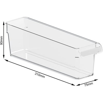 Plexisklový organizér v plnej hĺbke chladničky. Úzky rozmer na ukladanie úzkych a menších vecí. Neviem ale, aký odolný voči pádom z výšky, netrúfam si...