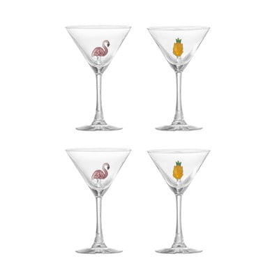 Poháre Misa od značky Bloomingville v súprave po štyroch kusoch dodajú vášmu stolovaniu hravý nádych. Súprava obsahuje dva kusy s motívom plameniaka a dva s motívom ananásu. Každý pohár je jedinečný vďaka ručnej výrobe a fúkaniu. Poháre sú ideálne na servírovanie koktailov.