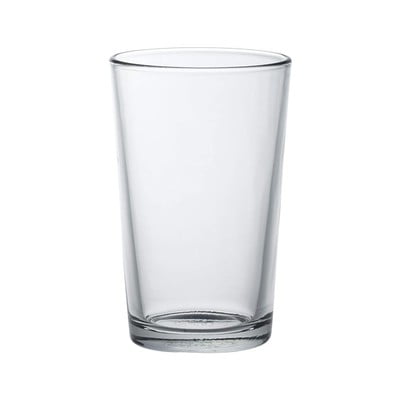 jednoduchý stabilný sklený pohár, trošku hrubšie sklo, zaoblený horný okraj