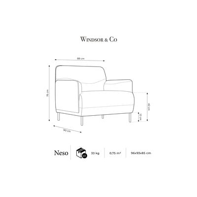 Windsor & Co Sofas je francúzska značka, ktorá predstavuje pohovky tej najvyššej kvality. Každý kúsok od týchto návrhárov je pretkaný štýlom a jedinečnosťou. Kolekcia Neso obsahuje luxusné kreslá v klasickom dizajne, ktoré sa stanú štýlovou súčasťou vašej obývačky snáď v akomkoľvek štýle. Poťah je z kvalitnej pevnej a na dotyk príjemnej látky, takže vás každého usadenia jemne pohladí po tele i duši. Táto husto tkaná látka má vlastnosťami, ktoré zabraňujú absorpcii rozliatych tekutín. Je tiež veľmi odolná proti oderu, čo výrazne znižuje riziko poškodenia. Materiál je totiž pokrytý špeciálnou ochrannou vrstvou, ktorá účinne blokuje vnikanie nečistôt. To umožní odstrániť škvrny bez použitia čistiacich prostriedkov. Tým pádom sa z kúskov od Windsor & Co Sofas stávajú poklady, ktoré vám budú robiť radosť mnoho rokov.