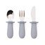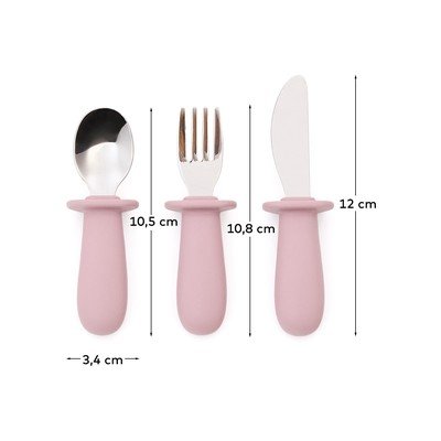 Súprava obsahuje lyžičku, vidličku a nôž. Všetky tri kusy majú robustné, ergonomické rukoväte zo silikónu, ktoré sú ideálne pre malé detské ruky. Kovové funkčné časti sú odolné a čepeľ noža je tupá a bezpečná pre deti.