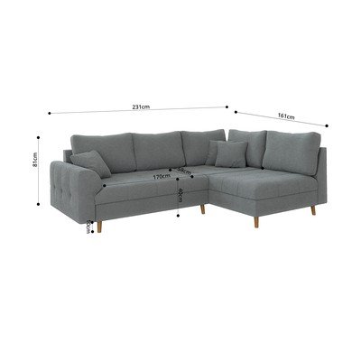 Z textílie buklé, pravý roh/do L, sivá, trojmiestna, šírka 231 cm