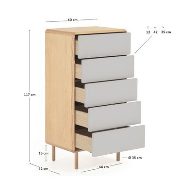 Komoda disponuje piatimi zásuvkami, ktoré sú pre pohodlné otváranie vybavené mechanizmom push-to-open. Jej dizajn sa vyznačuje zaoblenými hranami a štíhlymi nohami, ktoré sú navyše nastaviteľné, čo zaisťuje stabilitu aj na nerovnom povrchu.