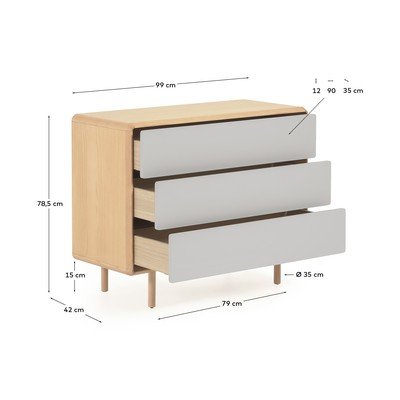 Komoda má tri zásuvky, ktoré sa otvárajú pomocou mechanizmu push-to-open. Jej zaoblené hrany a štíhle nôžky dodávajú nábytku ľahký vzhľad. Nohy sú navyše nastaviteľné, čo zaisťuje stabilitu na každom povrchu.