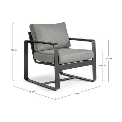 Kovové záhradné kreslo Merrigan v elegantnej antracitovej farbe od značky Bizzotto vnesie na vašu terasu moderný štýl. Kreslo je doplnené o pohodlný sivý vankúš na príjemné posedenie. Vďaka použitému materiálu a konštrukcii je kreslo odolné voči poveternostným vplyvom a vhodné na vonkajšie použitie.
