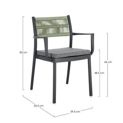 Záhradná stolička Alvin od značky Bizzotto v sebe spája moderný dizajn a komfort. Stolička je vyrobená z odolného plastu v elegantnej sivej farbe, ktorá sa ľahko kombinuje s ostatným záhradným nábytkom. Pre maximálne pohodlie je vybavená opierkami a odnímateľným vankúšom v sivej farbe. Výplet operadla v zelenej farbe dodáva stoličke Alvin svieži nádych a vytvára zaujímavý kontrast s tmavým rámom.