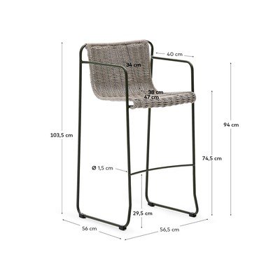 Barová stolička Maurina od značky Kave Home. Vďaka ručne tkanému sedáku z UV-odolného lana a galvanizovanej oceľovej konštrukcii je stolička vhodná na stopercentné vonkajšie použitie.