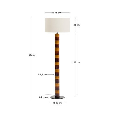 Stojacia lampa Mavran s textilným tienidlom od značky Kave Home. Glazovaná keramická základňa s pruhmi v teplých tónoch dodá každému priestoru dynamiku a osobitosť.