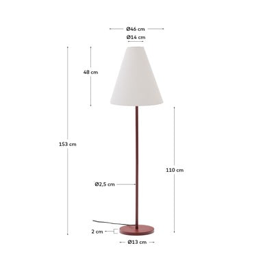 Stojacia lampa Navat od značky Kave Home vnáša do interiéru elegantný a zároveň minimalistický štýl. Lampa je vyrobená z kovu s terakotovou povrchovou úpravou a doplnená bielym textilným tienidlom v tvare kužeľa. Stojacia lampa je kompatibilná so žiarovkou typu E27 s maximálnym výkonom 40 W. Žiarovka nie je súčasťou balenia.