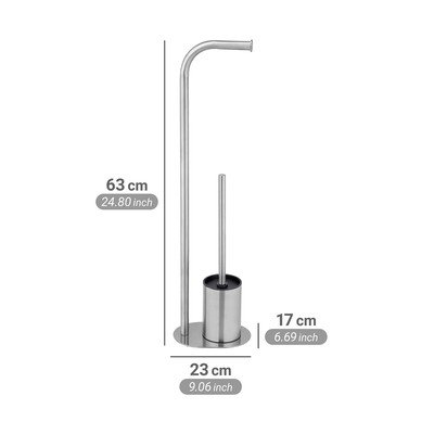 Tento voľne stojaci oceľový doplnok elegantne kombinuje držiak na toaletný papier s integrovanou WC kefou. Kefa je umiestnená v samostatnej nádobke na základni stojana a jej hlava má priemer 7,5 cm.