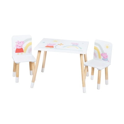Táto detská súprava nábytku obsahuje stôl a dve stoličky, ktoré sú navrhnuté na pohodlné a bezpečné sedenie. Vďaka kompaktným rozmerom sa skvele hodí do detskej izby alebo herného kútika. Stoličky majú výšku sedadla 28 cm, celkové rozmery 54 × 26,5 × 26,5 cm. Stôl meria 49 × 60 × 50 cm.