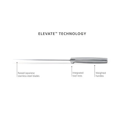 Nože sa do stojana zasúvajú do pozdĺžnych magnetických slotov, ktoré zaisťujú ich stabilitu. Nože majú ergonomické madlá Elevate s integrovanou opierkou, vďaka ktorej sa čepeľ noža nedotkne pracovnej plochy.