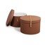 Urobte si doma poriadok pomocou súpravy dvoch praktických okrúhlych škatúľ značky Bigso Box of Sweden. Ich pevná konštrukcia je doplnená o funkčné aj okrasné nitovanie. Veko zdobí kožený popruh so sponou, ktorý uľahčuje otváranie.