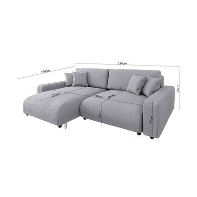 Menčestrová, rozkladacia/s úložným priestorom, pravý roh/ľavý roh/variabilná/s leňoškou, svetlosivá, trojmiestna, šírka 234 cm