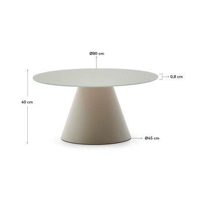 Doska stola je vyrobená z tvrdeného skla, pričom farba je zapracovaná už počas výroby, čo zaisťuje jednotný a trvácny vzhľad. Podstavec stola má kónický tvar a je z ocele s práškovým nástrekom. Táto povrchová úprava vytvára pevnú a odolnú vrstvu, ktorá chráni podstavec pred nárazmi, poškriabaním a opotrebovaním.
