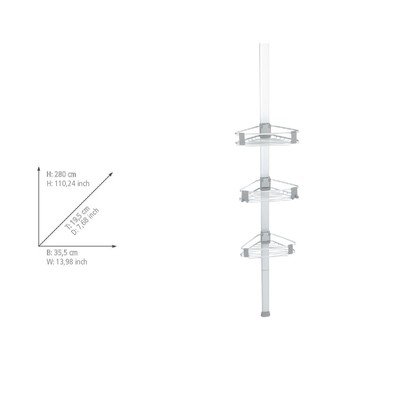 Polička disponuje tromi nastaviteľnými rohovými policami, ktoré sa dajú posúvať do strán a sú vybavené oválnou profilovou podperou. Jedna z týchto poličiek má navyše praktické háčiky, na ktoré si môžete zavesiť sprchovú špongiu, žinku alebo iné drobnosti. Vďaka teleskopickej konštrukcii je jej výška nastaviteľná v rozmedzí 188 až 280 cm, takže sa ľahko prispôsobí vašim potrebám.