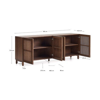 Komoda Beyla od značky Kave Home. Krídlové dvere so zvislými lamelami vytvárajú vizuálny rytmus a umožňujú hre svetla.