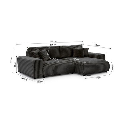 Menčestrová, rozkladacia/s úložným priestorom, pravý roh, tmavosivá, vodoodolná/odolná proti škvrnám, trojmiestna, šírka 255 cm