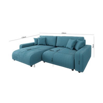 Menčestrová, rozkladacia/s úložným priestorom, pravý roh/ľavý roh/variabilná/s leňoškou, tyrkysovomodrá, trojmiestna, šírka 234 cm