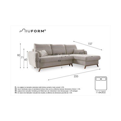 Podstavec z bukového dreva a šikmé nohy dodávajú pohovke ľahkosť. Na dotyk mäkká látka, neutrálne farby a jemné tvary vytvárajú nadčasový model pohovky, ktorý nevyjde z módy po jednej sezóne.