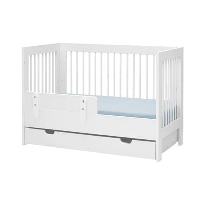 Variabilná detská postieľka rastie spolu s dieťaťom. Jednoducho môžete vybrať tyčky zo zábrany a vytvoriť tak bezpečný priestor pre dieťa, ktoré sa už snaží z postieľky samé vyliezť. Po kompletnom odstránení zábrany vznikne klasická pohodlná posteľ, ktorá ale svojím rozmerom zbytočne nezaberá v detskej izbe miesto na hranie. (Na začiatok odporúčame dať na posteľ bočnicu). Využite priestor pod postieľkou pomocou praktickej