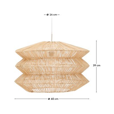 Závesné svietidlo Dakit od značky Kave Home vnesie do vášho interiéru príjemnú atmosféru. Tienidlo je ručne utkané z ratanu, čo mu dodáva osobitý tvar s vrstveným, harmonikovým vzhľadom. Svietidlo tak nielen osvetľuje priestor, ale zároveň slúži ako štýlový doplnok. Upozorňujeme, že objímka ani žiarovka nie sú súčasťou balenia.