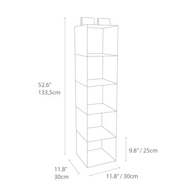 Praktický závesný organizér vám vďaka svojim piatim priehradkám pomôže so skladovaním odevov. Je ideálny na zavesenie do šatníkovej skrine či na tyč stojana. Konštrukcia je vyrobená z kartónu a odolného polyesteru. Drží pevne vďaka suchému zipsu. Produkt je možné v prípade potreby kedykoľvek zložiť a ušetriť tak miesto.