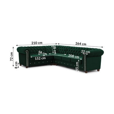 Zamatová, rozkladacia, chesterfield, ľavý roh/do L, zelená, vodoodolná/odolná proti škvrnám, štvormiestna, šírka 264 cm