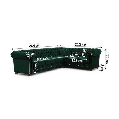 Zamatová, rozkladacia, chesterfield, pravý roh/do L, zelená, vodoodolná/odolná proti škvrnám, štvormiestna, šírka 264 cm