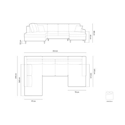 Zamatová, rozkladacia/s úložným priestorom, ľavý roh/do tvaru "U", zelená, viacmiestna, šírka 313 cm