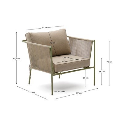 Záhradné kreslo Zivia od značky Kave Home. Vďaka odolnej konštrukcii z galvanizovanej ocele a ručne pletenému výpletu z UV-odolného lana je ideálne na 100% vonkajšie použitie.